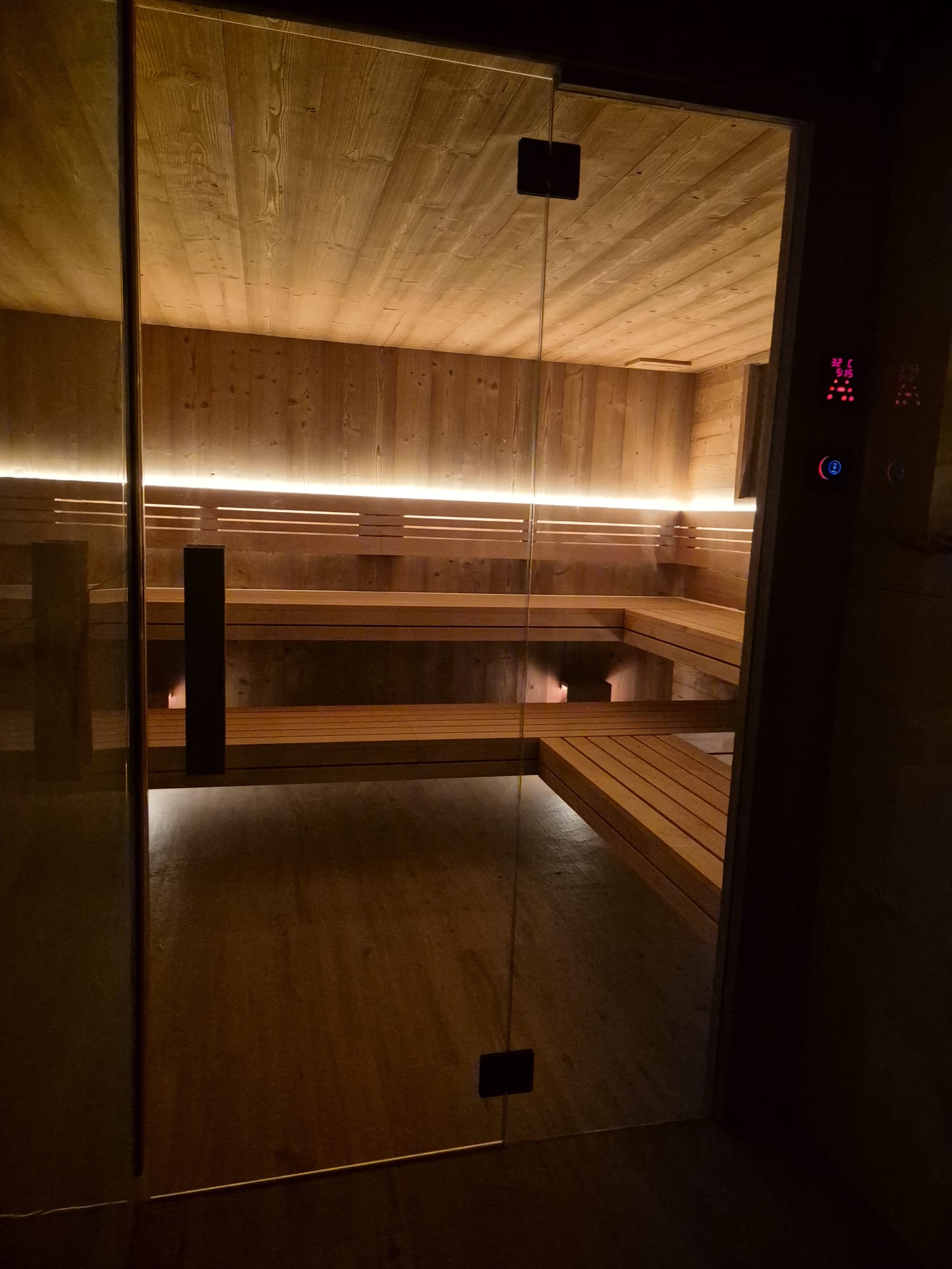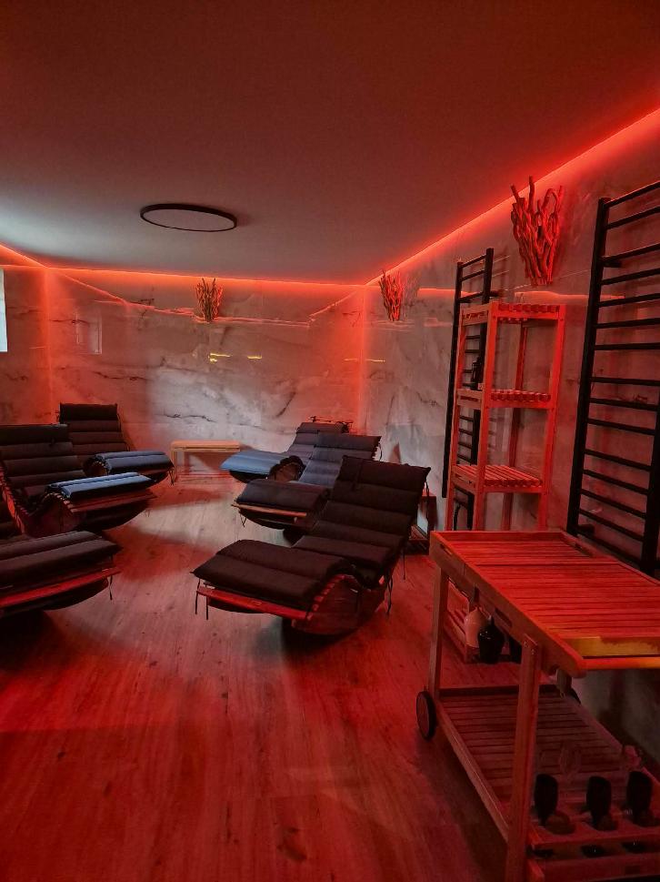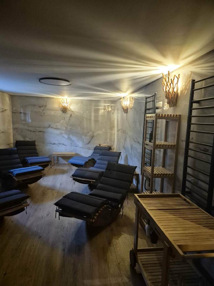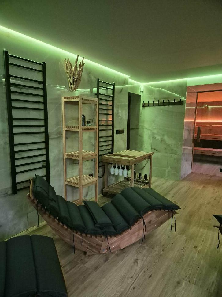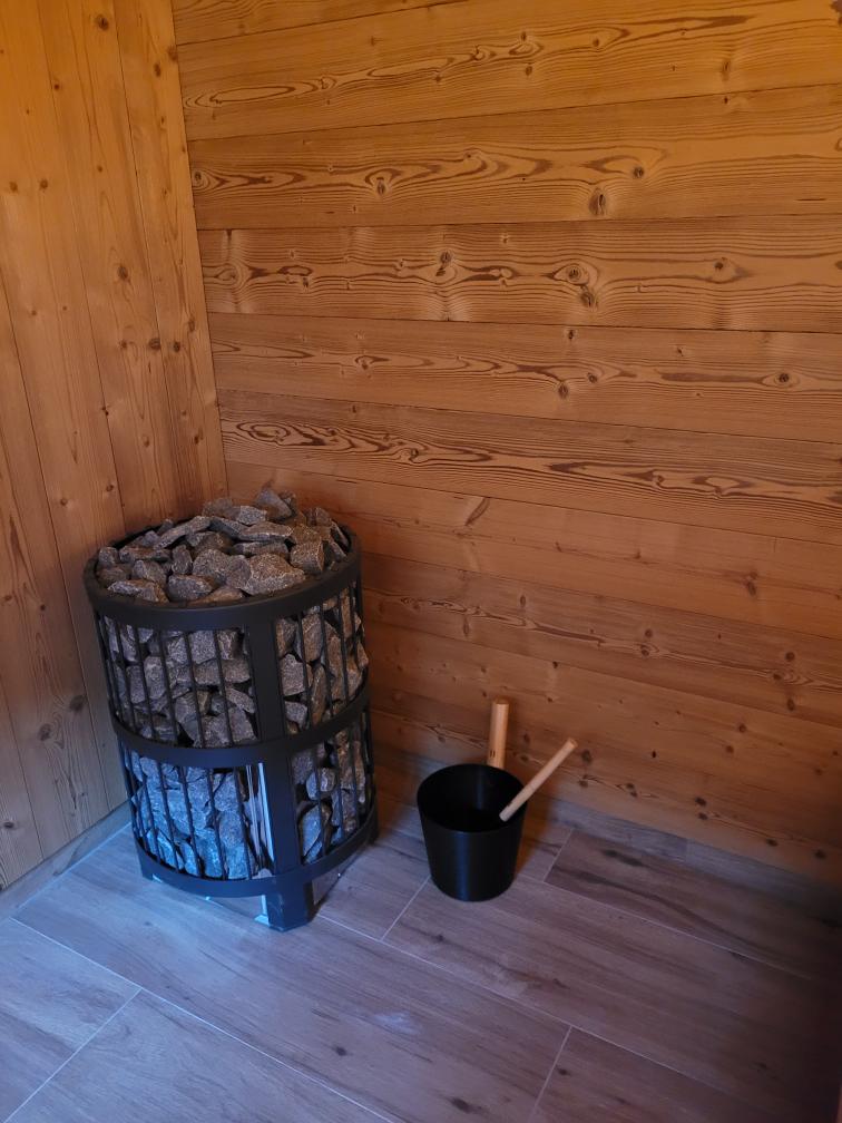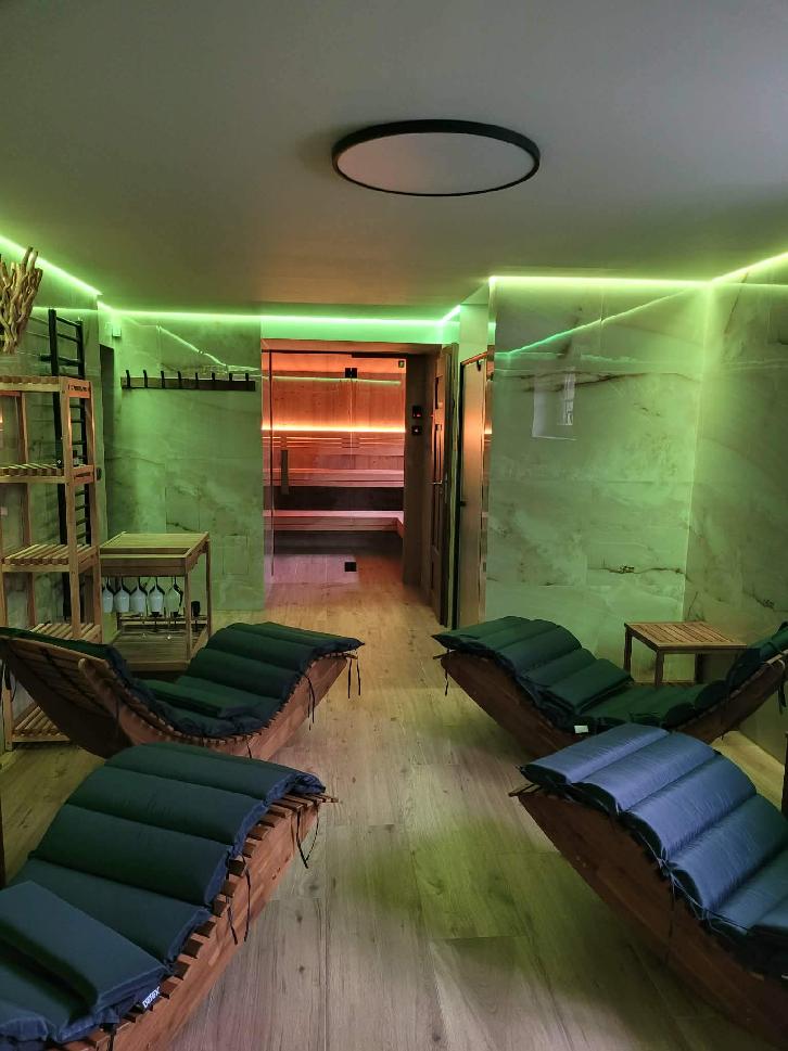 Základem je vnitřní sauna pro až 12 osob s vícestupňovými lavicemi, aromaterapií a možností vlastního ozvučení. Na saunu přímo navazuje klidná odpočívárna s lehátky, kde mohou hosté v tichu regenerovat mezi saunovacími cykly.