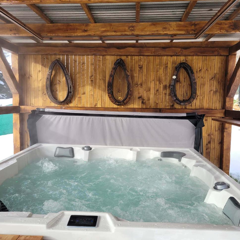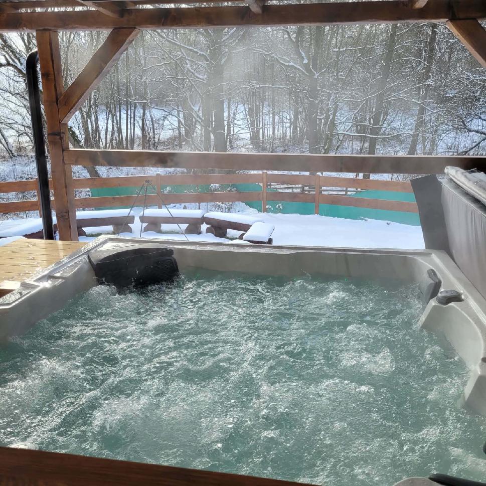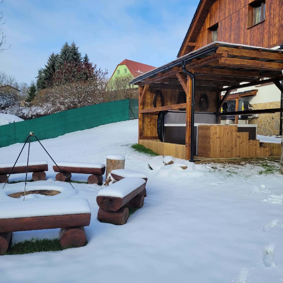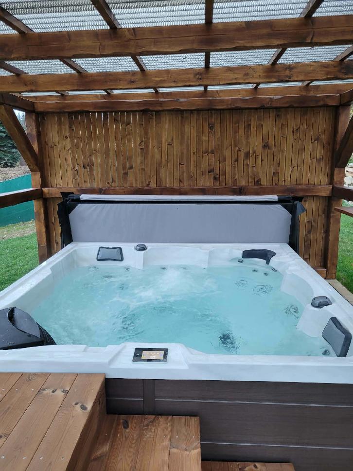 Součástí wellness je také zastřešená venkovní vířivka pro 5 osob v klidné části zahrady, vhodná k relaxaci po sauně i k večernímu posezení.
